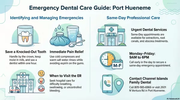 For a dental emergency in Port Hueneme, CA, call Channel Islands Family Dental at 805 985 6966. Located at 2601 N Ventura Rd, they are open Monday through Friday 9AM to 6PM and can often accommodate urgent cases the same day.